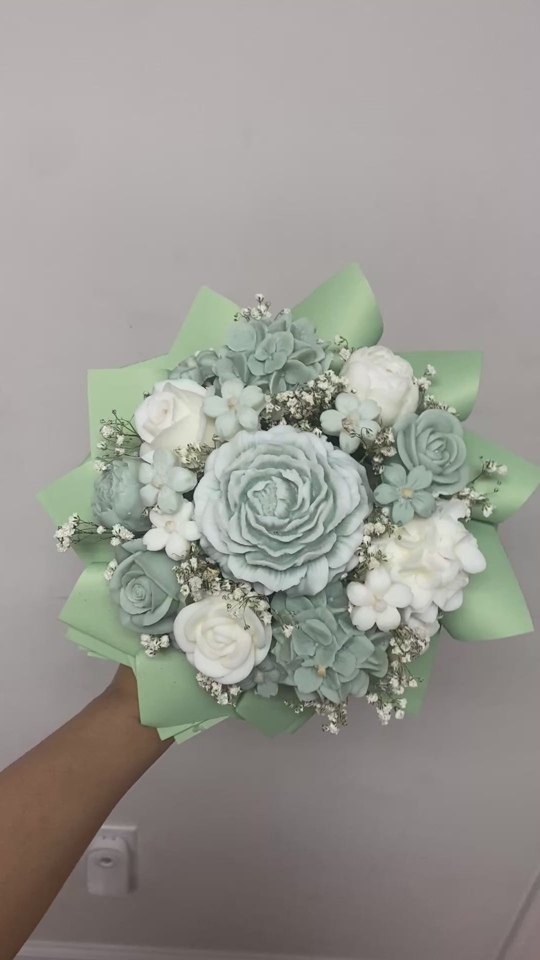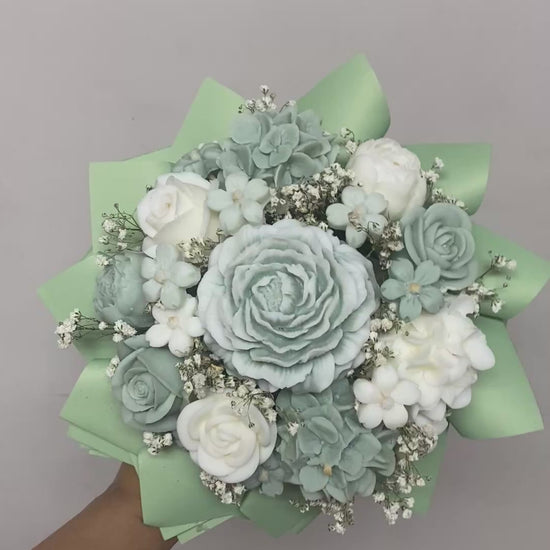 Scented mint green and white flower wax melt arrangement. These wax melts are to be picked off and melted onto a wax melter/warmer. If you don’t want to pick them off, you can simply have the bouquet as a decorative piece in your home or office.