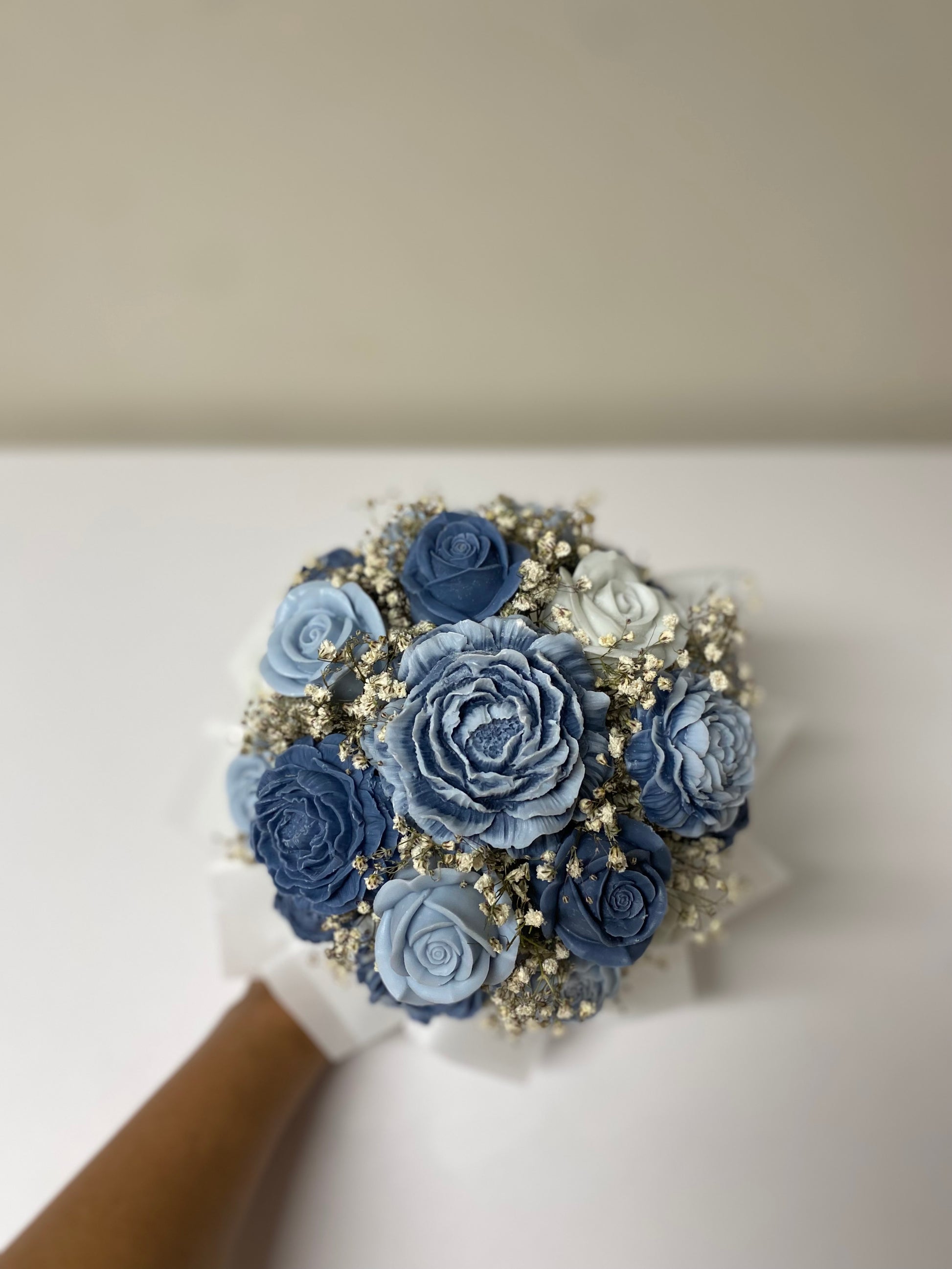 Na y blue and light blue flower arrangement with a radiating scent. These wax melts are to be picked off and melted onto a wax melter/warmer or simply have the bouquet as a decorative piece in your home or office.