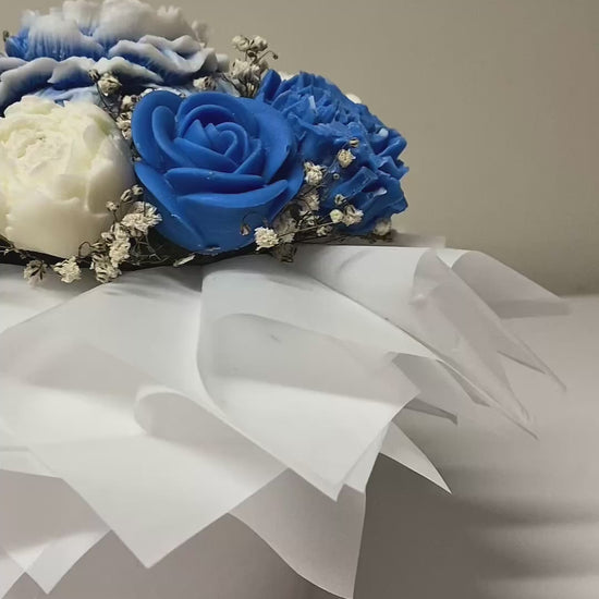 Royal blue and white flower arrangement with a radiating scent. These wax melts are to be picked off and melted onto a wax melter/warmer or simply have the bouquet as a decorative piece in your home or office.